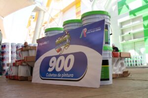 “Hoy realizamos la entrega de 8 mil metros cuadrados de malla sombra, 300 muebles de baño, 200 lavabos, 7 toneladas de cemento, 800 lámparas, 17 mil 840 litros de pintura, 250 estantes, 200 paquetes de material deportivo, 3 mil litros de impermeabilizante y 31 toneladas de pega piso. Acciones que, aunque pueden parecer sencillas, tienen un impacto profundo en la generación de entornos de paz”, destacó.